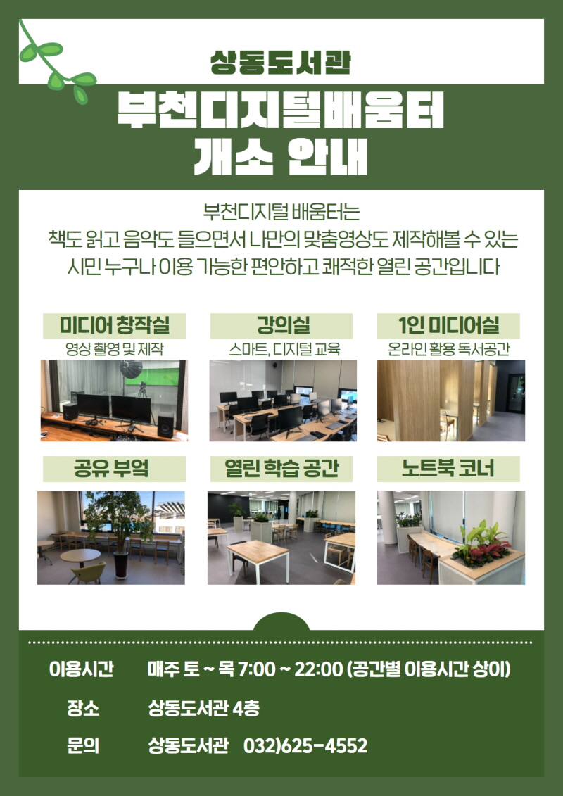 ¶ÇÇÑ ½Ã¹ÎµéÀÇ ¾ÈÀüÇÏ°í Æí¸®ÇÑ µ¶¼È¯°æ Á¶¼º ¹× µðÁöÅÐ ¿ª·® ±³À°À» °ÈÇϱâ À§ÇÑ ¸ÂÃãÇü °ø°£À¸·Î ¡â½º¸¶Æ®Æù Ȱ¿ë°ú À¯Æ©ºê µî ¿Â¶óÀÎ ÄÜÅÙÃ÷ Á¦ÀÛ °ÀǸ¦ À§ÇÑ °ÀÇ½Ç ¡âÃÔ¿µ°ú ÆíÁýÀÌ °¡´ÉÇÑ ¹Ìµð¾îâÀÛ½Ç ¡âµ¶¼ÄÜÅÙÃ÷ Á¦ÀÛ ¹× ¼ÛÃâÀ» À§ÇÑ 1ÀÎ ¹Ìµð¾î½Ç ¡â°¢Á¾ ¸ðÀÓ ¹× µ¿¾Æ¸® ¼¼¹Ì³ª½Ç ¡â°øÀ¯ºÎ¾ý µîÀ» ¸¶·ÃÇß´Ù. ¿ÀÀü 7½ÃºÎÅÍ ¿ÀÈÄ 10½Ã±îÁö ÀÚÀ¯·Ó°Ô ÀÌ¿ëÇÒ ¼ö ÀÖ´Ù.