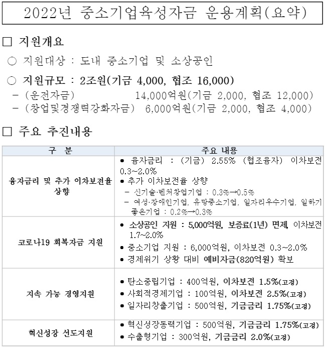 ½Å¼ºÀ嵿·Â À°¼ºÀ» À§ÇÑ Áö¼Ó¼ºÀå ½Ã¼³ÀÚ±Ý Áö¿ø ½Å¼³ ´ëÃâ±Ý ¿¬Ã¼·Î ÀÎÇÑ ÇÇÇØ ¿¹¹æÀ» À§ÇÑ ¿ø±Ý»óȯ À¯¿¹±â°£(6°³¿ù) Ãß°¡ ¿¬Àå°æ±âµµ°¡ µµ³» Áß¼Ò±â¾÷·¼Ò»ó°øÀÎÀÇ °æ¿µ¾ÈÁ¤À» À§ÇÑ ‘2022³âµµ Áß¼Ò±â¾÷ À°¼ºÀڱݒ ±Ô¸ð¸¦ 2Á¶ ¿øÀ¸·Î È®Á¤Çß´Ù. ³»³â¿¡´Â Äڷγª19 »óȲ¿¡ ´ëÇÑ °æÁ¦È¸º¹°ú ½Å¼ºÀ嵿·Â À°¼º¿¡ ´ëÇÑ Áö¿ø¿¡ ÃÊÁ¡À» ¸ÂÃâ ¹æÄ§ÀÌ´Ù.