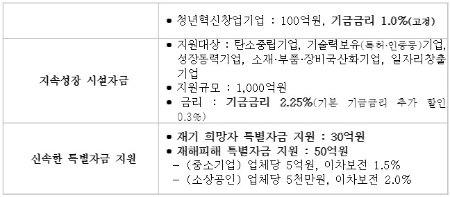 ¶ÇÇÑ ½Ã¼³ÀÚ±Ý Áß 1,000¾ï ¿øÀ» ź¼ÒÁ߸³±â¾÷, ÀÏÀÚ¸®Ã¢Ãâ±â¾÷, ¼ÒÀç·ºÎǰ·Àåºñ ±¹»êȱâ¾÷, ±â¼ú·Âº¸À¯(ƯÇã·ÀÎÁõ µî) ±â¾÷ µîÀ» À§ÇÑ ‘Áö¼Ó ¼ºÀå ½Ã¼³ÀڱݒÀ¸·Î ¹èÁ¤Çß´Ù. ¾÷ü´ç 30¾ï ¿ø À̳»¿¡¼ ±Ý¸® 2.25%(±âº»±Ý¸®¿¡¼ 0.3% ÇÒÀÎ)´ë·Î Áö¿øÀÌ ÀÌ·ïÁöµµ·Ï ÇØ º¯ÈÇÏ´Â ±Û·Î¹ú °æÁ¦·»ê¾÷ ȯ°æ¿¡ ¹ß¸ÂÃá ¼ºÀ嵿·Â À°¼º¿¡µµ Àû±ØÀûÀ¸·Î Èû¾µ °èȹÀÌ´Ù.