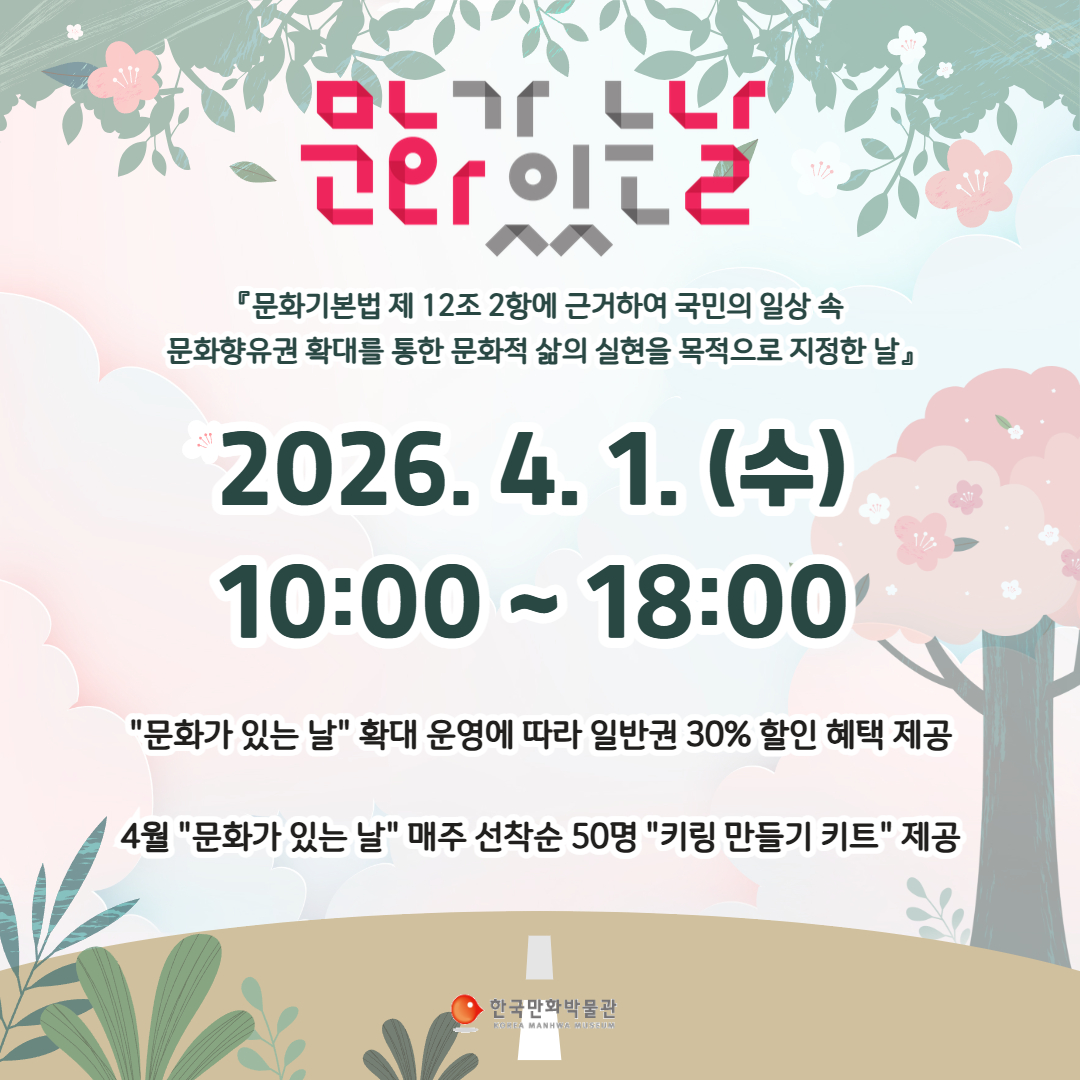 한국만화박물관이 오는 4월 1일부터 시민들의 문화 향유 기회를 넓히기 위한 ‘문화가 있는 날’ 혜택을 전격 도입한다.